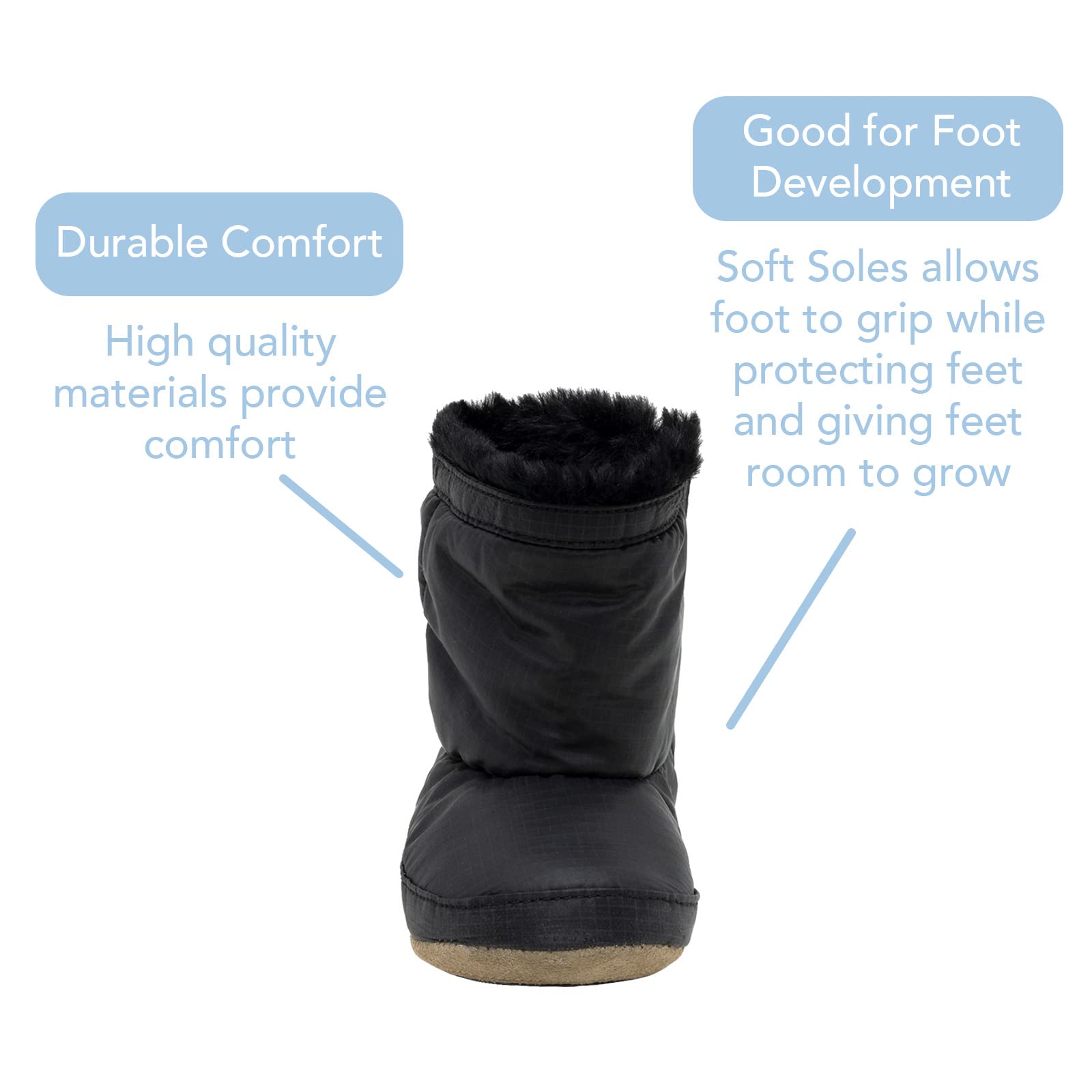 - DESIGN, FUNCTION AND QUALITY: Structured silhouette looks, feels, and operates like a shoe, perfect for early and beginner walkers. Faux fur or sherpa lining keeps your baby’s feet warm and comfortable all-day long. Perfect for everyday use during cooler weather. Suitable for indoor and light outdoor use, not waterproof or snow-proof.