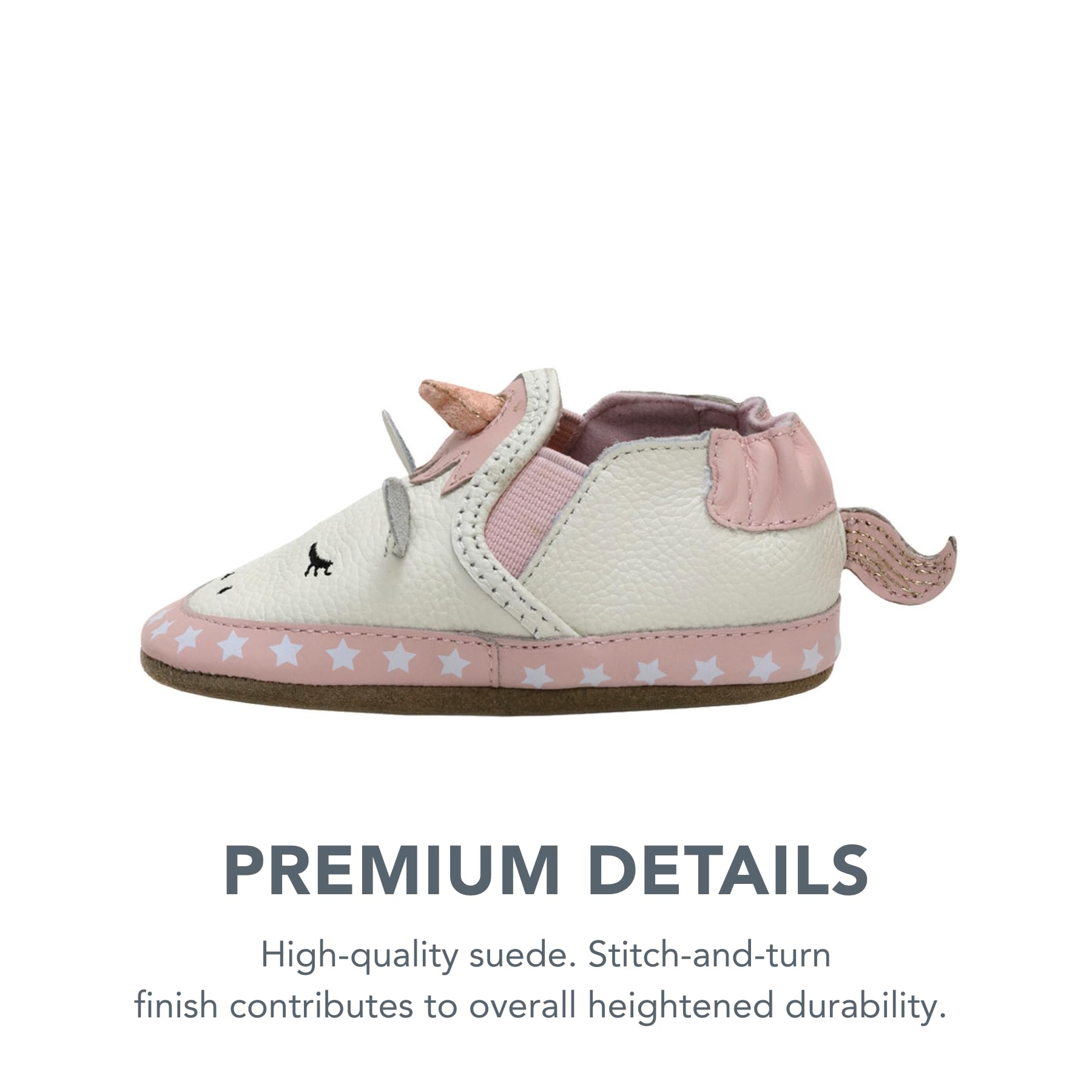 - Evie Unicorn Inspired Design: Premium soft leather baby shoe features a playful unicorn face with embroidered eyelashes shimmering horn and ear accents with gentle pink trim and star printed toe detail. Stretch side panels allow easy entry while the whimsical design makes this crib shoe a thoughtful and giftable option for baby showers birthdays or special occasions